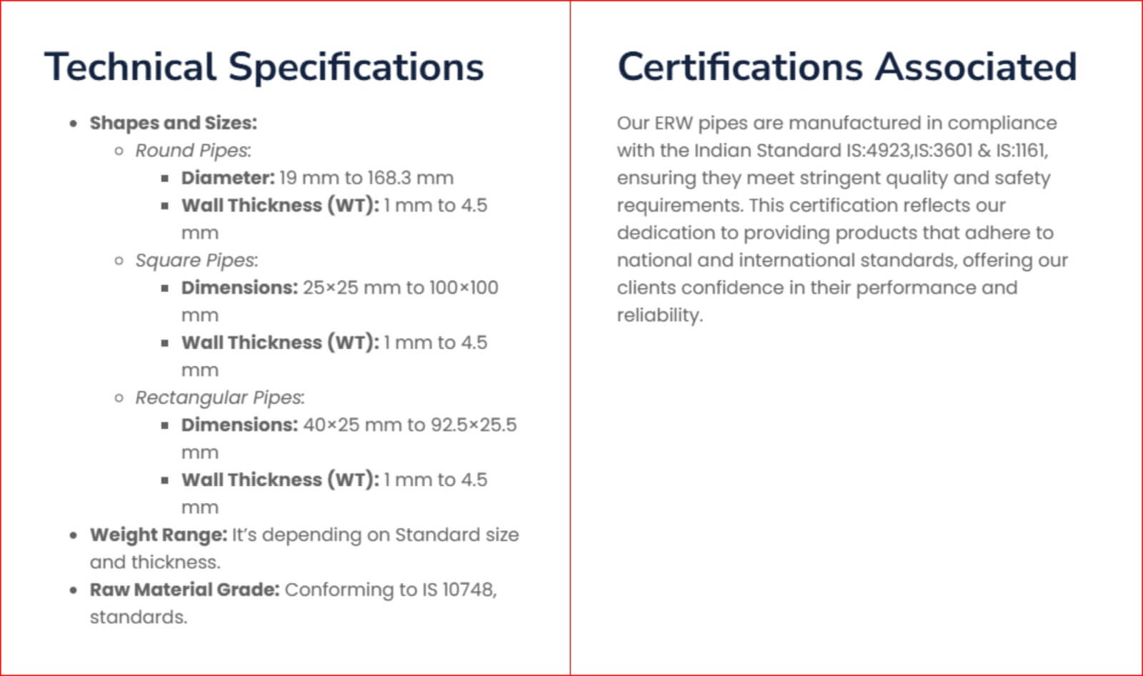 Electric Resistance Welded (ERW) pipes are high-quality steel pipes formed by cold-forming steel coils into cylindrical shapes. The edges are then welded together using electric resistance welding, resulting in a strong, seamless bond. ERW pipes are widely used for conveying fluids and gases, as well as for structural applications across various industries. Our pipes and tubes are passed in engineering and autoparts products. We make customised sizes as per order .